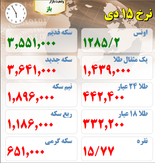 آخرین قیمت های بازار طلا و سکه پانزدهم دیماه :
