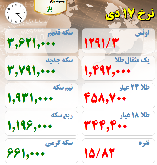 قیمت های بازار طلا و سکه نیمروز هفدهم دیماه :