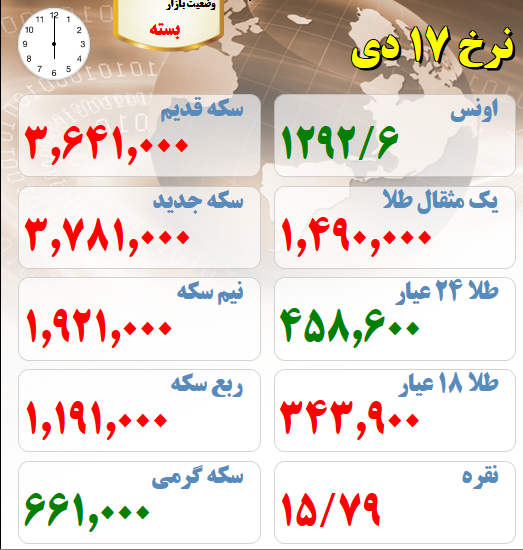 آخرین قیمت های بازار طلا و سکه هفدهم دیماه قیمت طلا و سکه در بازار تهران تاریخ: ۱۷/دي/۹۷ ساعت ۱۸:۰۵ | اقتصاد ایران شناسه خبر: ۵۰۲۱۳ منبع: سایت طلا خبر را برای من بخوان آخرین قیمت های بازار طلا و سکه هفدهم دیماه : (لحظه تنظیم خبر) برچسب ها : قیمت طلا قیمت سکه گرمی قیمت سکه طلا و سکه سکه امامی قیمت نیم سکه