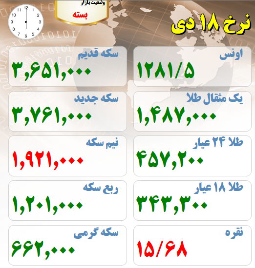 آخرین قیمت های بازار طلا و سکه هجدهم دیماه قیمت طلا و سکه در بازار تهران تاریخ: ۱۸/دي/۹۷ ساعت ۱۸:۰۰ | اقتصاد ایران شناسه خبر: ۵۰۲۴۱ منبع: سایت طلا خبر را برای من بخوان آخرین قیمت های بازار طلا و سکه هجدهم دیماه : (لحظه تنظیم خبر) برچسب ها : هرگرم طلا 18 عیار قیمت نیم سکه قیمت طلا قیمت سکه امامی قیمت سکه طلا و سکه قیمت ربع سکه
