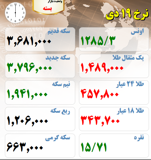 آخرین قیمت های بازار طلا و سکه نوزدهم دیماه :