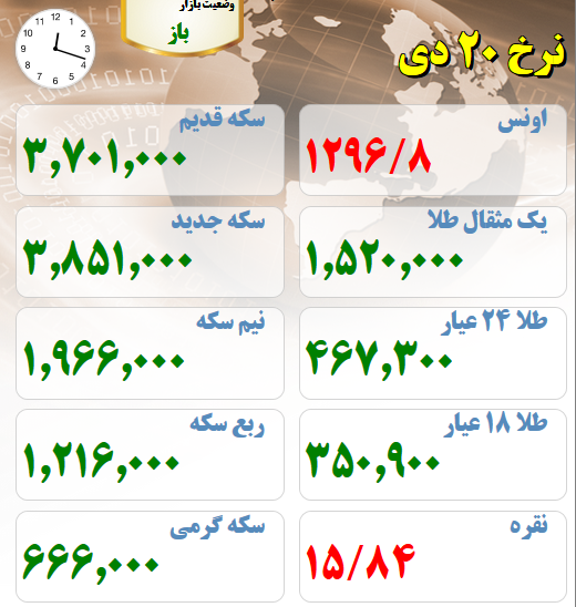 3. قیمت های بازار طلا و سکه نیمروز بیستم دیماه