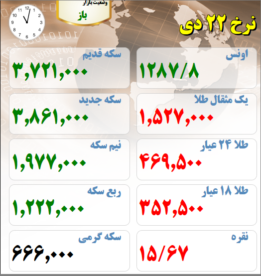 قیمت های بازار طلا و سکه امروز بیست و دوم دیماه افزایش قیمت طلا و سکه در بازار تهران تاریخ: ۲۲/دي/۹۷ ساعت ۱۱:۰۴ | اقتصاد ایران شناسه خبر: ۵۰۳۳۰ منبع: سایت طلا خبر را برای من بخوان قیمت های بازار طلا و سکه امروز بیست و دوم دیماه : (لحظه تنظیم خبر) برچسب ها : قیمت ربع سکه طلا و سکه بازار طلا نیم سکه
