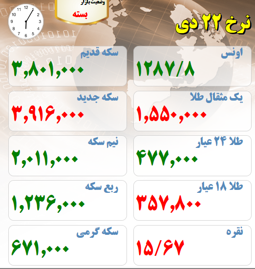 آخرین قیمت های بازار طلا و سکه بیست و دوم دیماه :