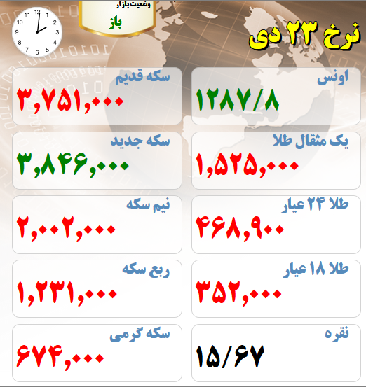 قیمت های بازار طلا و سکه نیمروز بیست و سوم دیماه قیمت طلا و سکه در بازار تهران تاریخ: ۲۳/دي/۹۷ ساعت ۱۴:۰۲ | اقتصاد ایران شناسه خبر: ۵۰۳۸۳ منبع: سایت طلا خبر را برای من بخوان قیمت های بازار طلا و سکه نیمروز بیست و سوم دیماه : (لحظه تنظیم خبر) برچسب ها : قیمت طلا قیمت سکه طلا و سکه نیم سکه ربع سکه هرگرم طلا 18 عیار قیمت مظنه طلا