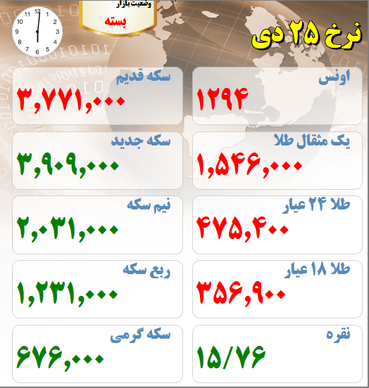 آخرین قیمت های بازار طلا و سکه بیست و پنجم دیماه :