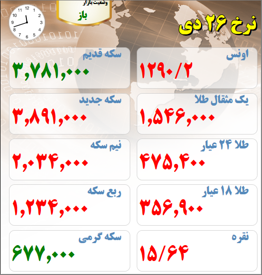 قیمت های بازار طلا و سکه امروز بیست و ششم دیماه قیمت طلا و سکه در بازار تهران تاریخ: ۲۶/دي/۹۷ ساعت ۱۱:۴۴ | اقتصاد ایران شناسه خبر: ۵۰۴۷۰ منبع: سایت طلا خبر را برای من بخوان قیمت های بازار طلا و سکه امروز بیست و ششم دیماه : (لحظه تنظیم خبر) برچسب ها : قیمت طلا قیمت اونس طلا ربع سکه اونس طلا قیمت هر گرم طلای 18 عیار نیم سکه