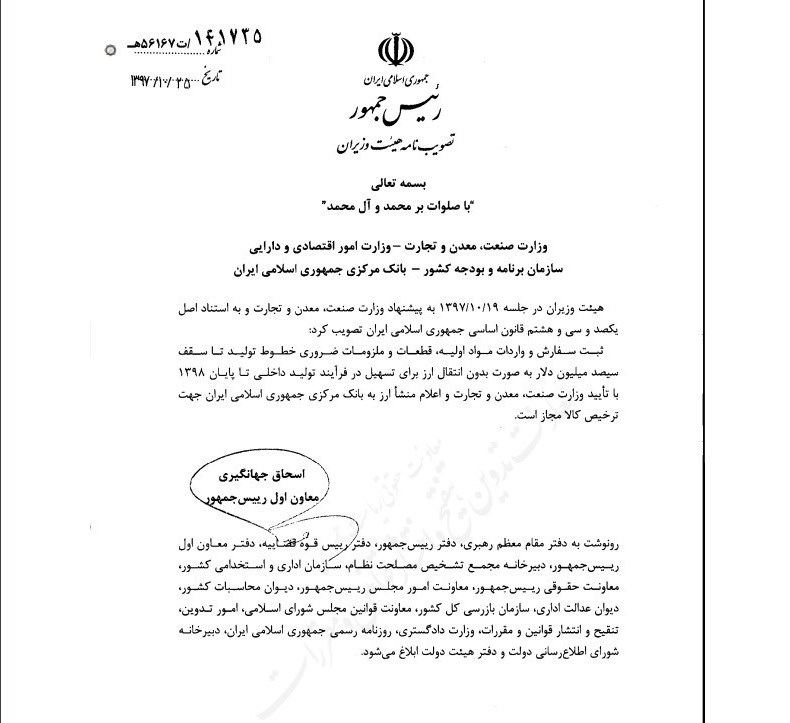 اسحاق جهانگیری معاون اول رئیس جمهور روز گذشته این موضوع را به وزارتخانه های صنعت،معدن و تجارت، امور اقتصادی و دارایی،سازمان برنامه و بودجه و بانک مرکزی ابلاغ کرد.