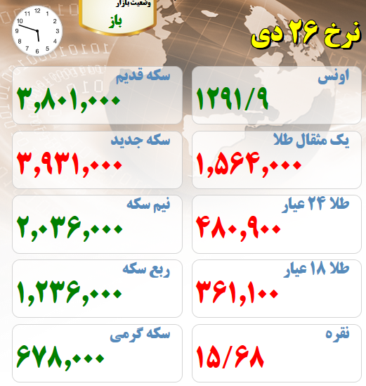 آخرین قیمت های بازار طلا و سکه بیست و ششم دیماه :