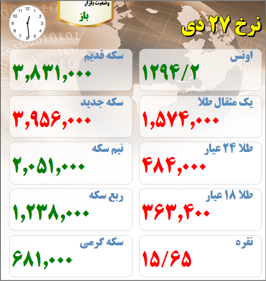 3. قیمت های بازار طلا و سکه نیمروز بیست و هفتم دیماه