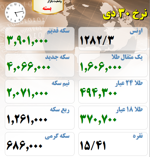 آخرین قیمت های بازار طلا و سکه سی و ام دیماه :
