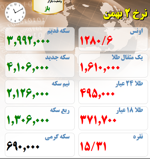 قیمت های بازار طلا و سکه امروز دوم بهمن ماه :