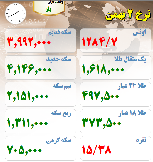 قیمت های بازار طلا و سکه نیمروز دوم بهمن ماه :