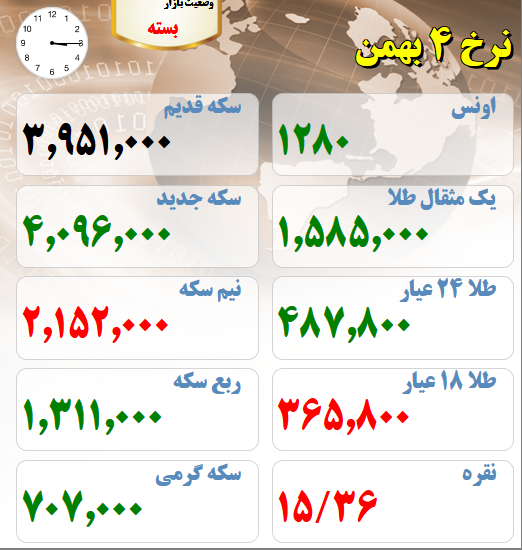 آخرین قیمت های بازار طلا و سکه چهارم بهمن ماه :