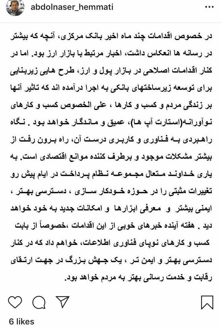 رئیس کل بانک مرکزی در یادداشتی در فضای مجازی نوشت:
