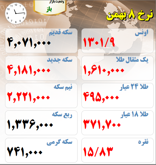 قیمت های بازار طلا و سکه امروز هشتم بهمن ماه قیمت طلا و سکه در بازار تهران تاریخ: ۸/بهمن/۹۷ ساعت ۱۱:۱۶ | اقتصاد ایران شناسه خبر: ۵۰۸۵۴ منبع: سایت طلا خبر را برای من بخوان قیمت های بازار طلا و سکه امروز هشتم بهمن ماه : (لحظه تنظیم خبر) برچسب ها : قیمت هر گرم طلای 18 عیار قیمت طلا قیمت سکه سکه گرمی نیم سکه