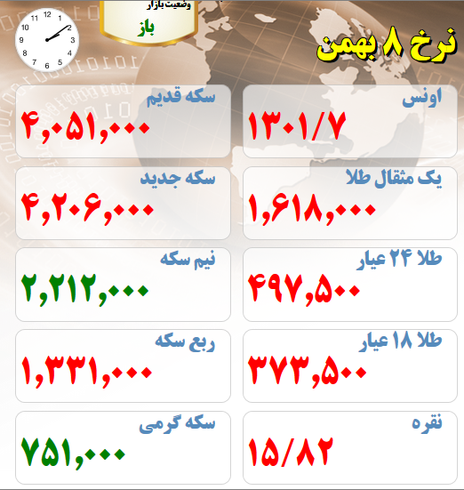 قیمت های بازار طلا و سکه نیمروز هشتم بهمن ماه :