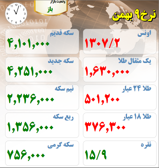 قیمت های بازار طلا و سکه امروز نهم بهمن ماه قیمت طلا و سکه در بازار تهران تاریخ: ۹/بهمن/۹۷ ساعت ۱۱:۰۵ | اقتصاد ایران شناسه خبر: ۵۰۹۰۴ منبع: سایت طلا خبر را برای من بخوان قیمت های بازار طلا و سکه امروز نهم بهمن ماه : (لحظه تنظیم خبر) برچسب ها : قیمت طلا قیمت سکه بهار آزادی قیمت سکه امامی قیمت سکه ربع سکه نیم سکه