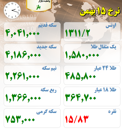 قیمت های بازار طلا و سکه نیمروز پانزدهم بهمن ماه :