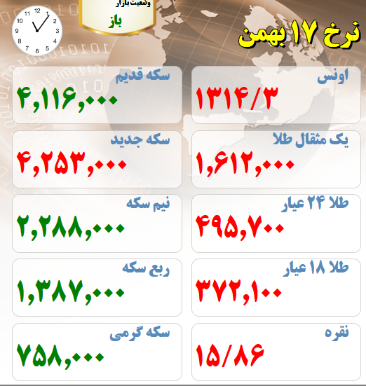قیمت های بازار طلا و سکه امروز هفدهم بهمن ماه قیمت طلا و سکه در بازار تهران تاریخ: ۱۷/بهمن/۹۷ ساعت ۱۱:۰۸ | اقتصاد ایران شناسه خبر: ۵۱۱۶۲ منبع: سایت طلا خبر را برای من بخوان قیمت های بازار طلا و سکه امروز هفدهم بهمن ماه : (لحظه تنظیم خبر) برچسب ها : هر گرم طلا 18 عیار قیمت نیم سکه قیمت طلا قیمت سکه قیمت ربع سکه طلای سکه