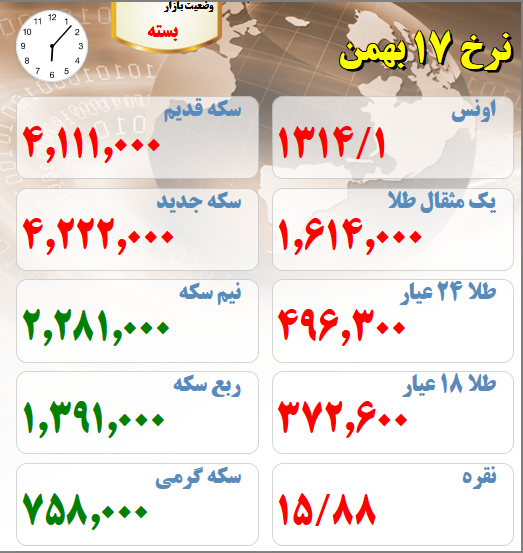 آخرین قیمت های بازار طلا و سکه هفدهم بهمن ماه :