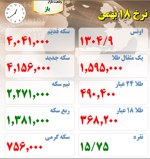 قیمت های بازار طلا و سکه نیمروز هجدهم بهمن ماه :