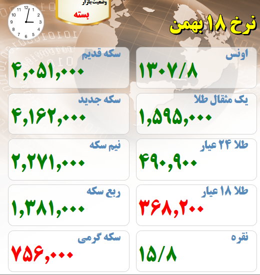 آخرین قیمت های بازار طلا و سکه هجدهم بهمن ماه :