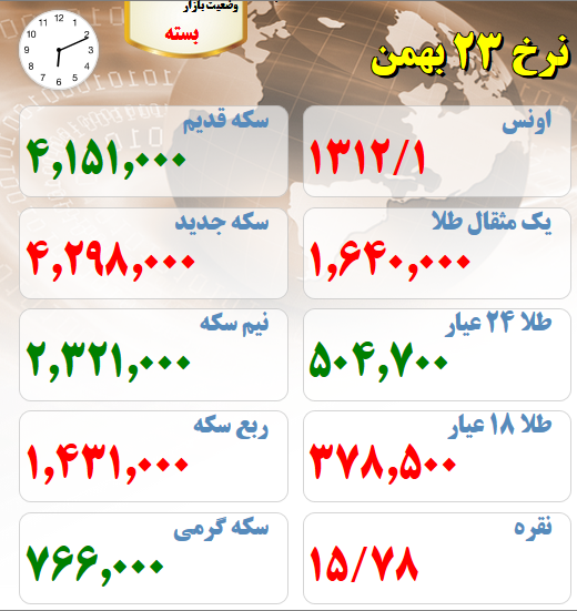 آخرین قیمت های بازار طلا و سکه بیست سوم بهمن ماه :