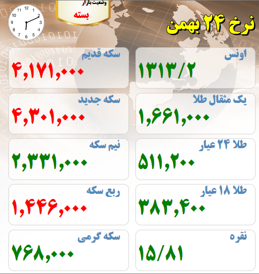 آخرین قیمت های بازار طلا و سکه بیست چهارم بهمن ماه :