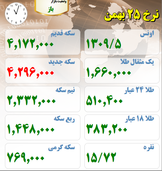 قیمت های بازار طلا و سکه امروز بیست و پنجم بهمن ماه قیمت طلا و سکه در بازار تهران تاریخ: ۲۵/بهمن/۹۷ ساعت ۱۱:۰۶ | اقتصاد ایران شناسه خبر: ۵۱۳۴۷ منبع: سایت طلا خبر را برای من بخوان قیمت های بازار طلا و سکه امروز بیست و پنجم بهمن ماه : (لحظه تنظیم خبر) برچسب ها : قیمت مظنه طلا قیمت طلا قیمت سکه طلا و سکه نرخ سکه