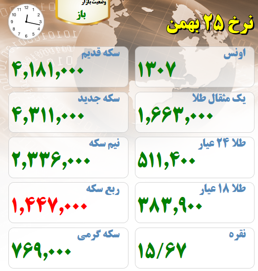 قیمت های بازار طلا و سکه نیمروز بیست و پنجم بهمن ماه :