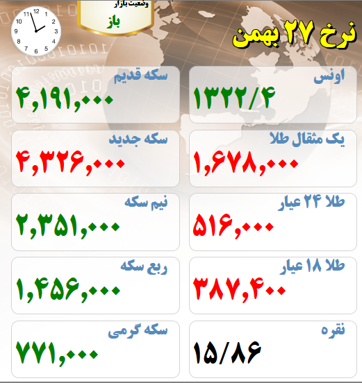 قیمت های بازار طلا و سکه نیمروز بیست و هفتم بهمن ماه :