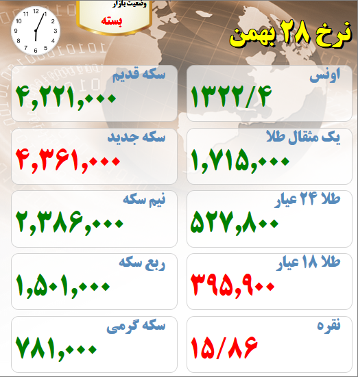 آخرین قیمت های بازار طلا و سکه بیست هشتم بهمن ماه :