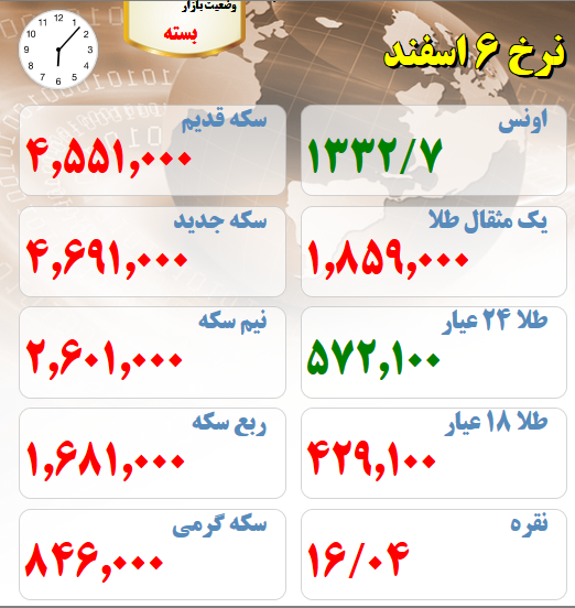 آخرین قیمت های بازار طلا و سکه ششم اسفند ماه :