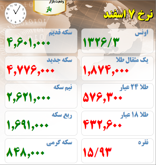 قیمت های بازار طلا و سکه امروز هفتم اسفند ماه :