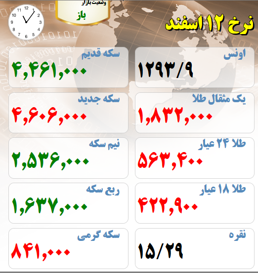 قیمت های بازار طلا و سکه امروز دوازدهم اسفند ماه قیمت طلا و سکه در بازار تهران تاریخ: ۱۲/اسفند/۹۷ ساعت ۱۱:۰۹ | اقتصاد ایران شناسه خبر: ۵۱۸۴۰ منبع: سایت طلا خبر را برای من بخوان قیمت های بازار طلا و سکه امروز دوازدهم اسفند ماه : (لحظه تنظیم خبر) برچسب ها : نیم سکه مظنه طلا قیمت طلا قیمت سکه طلا و سکه ربع سکه هر گرم طلا 18 عیار