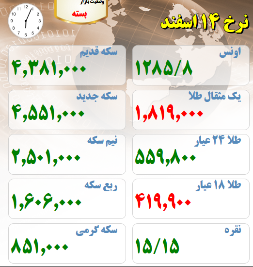آخرین قیمت های بازار طلا و سکه چهاردهم اسفند ماه :
