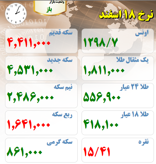 قیمت های بازار طلا و سکه نیمروز هجدهم اسفند ماه :