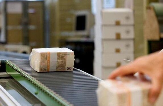 ۶- آماده سازی نهایی: دستگاههای شماره گذاری فوق امنیتی به هر اسکناس یک شماره سریال مخصوص میدهد که با توجه به هر دستگاه متفاوت است و بدین ترتیب کار جعل اسکناس را بسیار سخت میکند. اسکناسها سپس برای توزیع بین کشورهای عضو منطقه یورو بر اساس سهمیه آنها دسته بندی میشوند.