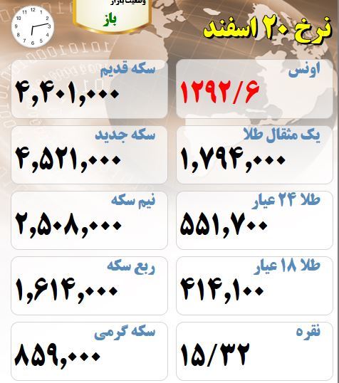 آخرین قیمت های 20 اسفند تاریخ: ۲۰/اسفند/۹۷ ساعت ۱۸:۲۰ | اقتصاد ایران شناسه خبر: ۵۲۱۳۵ خبر را برای من بخوان اونس طلا1292.5 مظنه1,792,500 18 گرم413,800 ارزش سکه4,038,503 قدیم (بهار)4,401,000 جدید (امامی)4,521,000 نیم2,508,000 ربع1,614,000 برچسب ها : سایت طلا آخرین نرخ