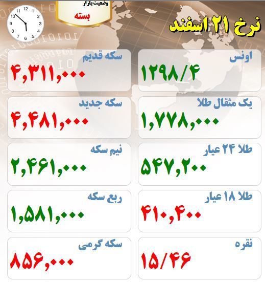آخرین قیمت های بازار طلا و سکه بیست و یکم اسفند ماه :