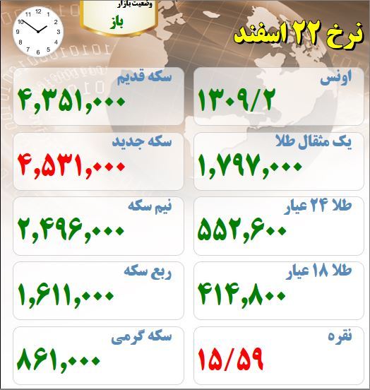 قیمت های بازار طلا و سکه نیمروز بیست و دوم اسفند ماه :