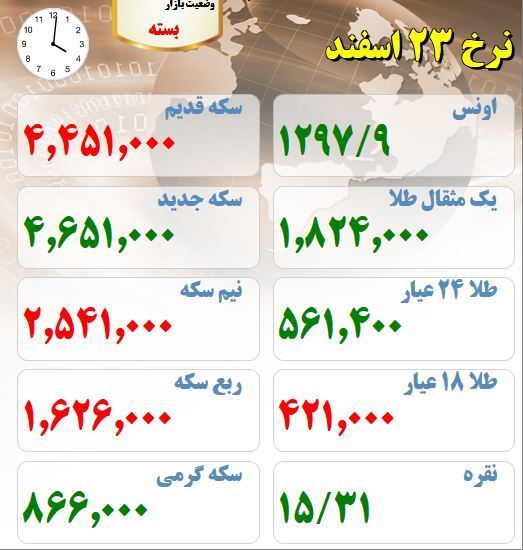 آخرین قیمت های بازار طلا و سکه بیست و سوم اسفند ماه :