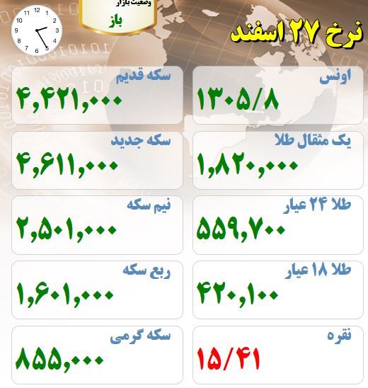 قیمت های بازار طلا و سکه نیمروز بیست و هفتم اسفند ماه :