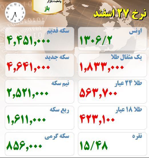 آخرین قیمت های بازار طلا و سکه بیست و هفتم اسفند ماه :