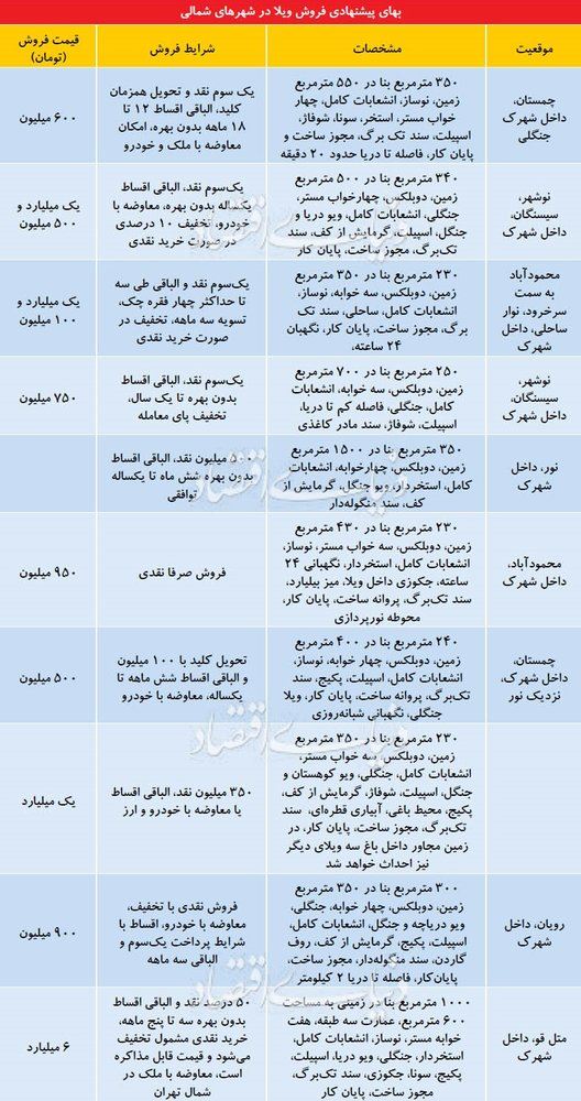قیمت ویلا در مناطق مختلف استان مازندران/جدول