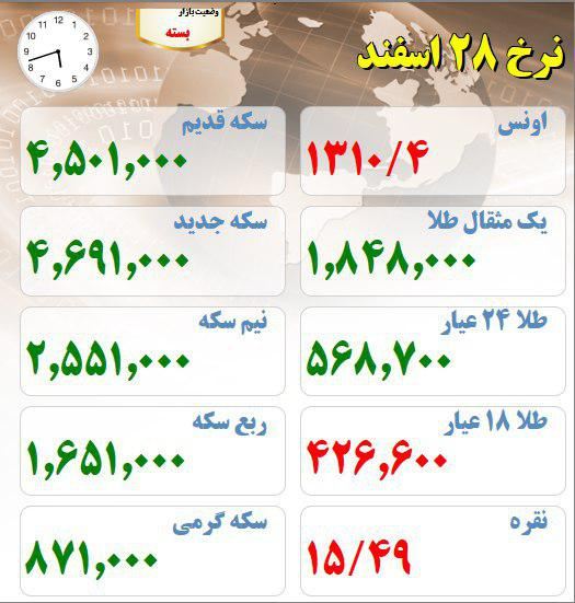 آخرین قیمت های بازار طلا و سکه بیست و هشتم اسفند ماه :