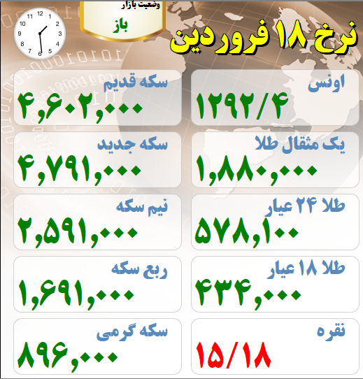 قیمت های بازار طلا و سکه امروز هجدهم فروردین ماه قیمت طلا و سکه در بازار تهران تاریخ: ۱۸/فروردين/۹۸ ساعت ۱۳:۳۲ | اقتصاد ایران شناسه خبر: ۵۲۵۵۸ منبع: سایت طلا خبر را برای من بخوان قیمت های بازار طلا و سکه امروزهجدهم فروردین ماه : (لحظه تنظیم خبر) برچسب ها : قیمت طلا قیمت سکه طلا و سکه مثقال طلا