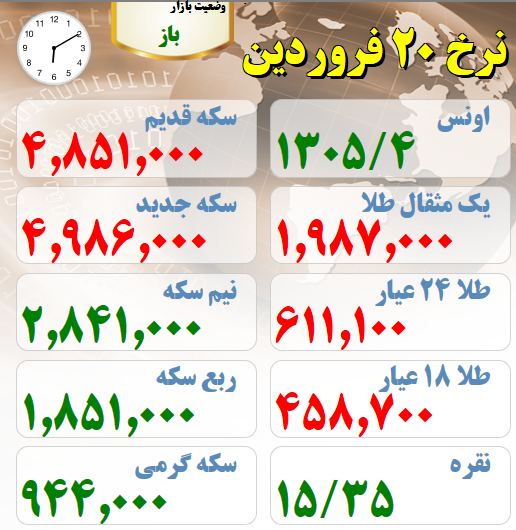 آخرین قیمت های بازار طلا و سکه بیستم فروردین ماه :