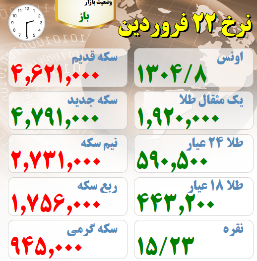 آخرین قیمت های بازار طلا و سکه بیست و دوم فروردین ماه :